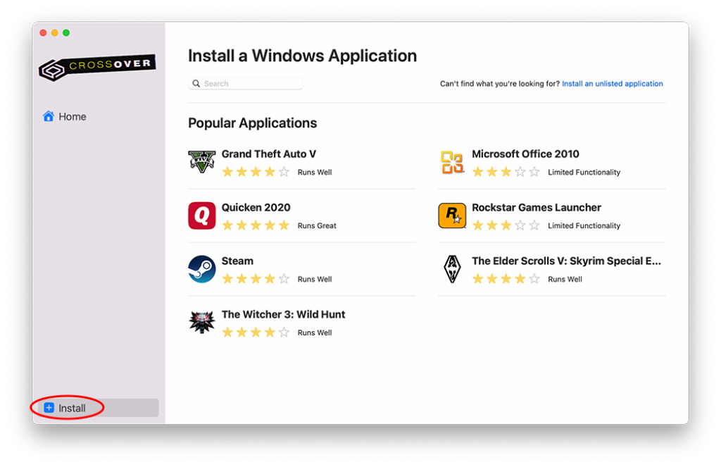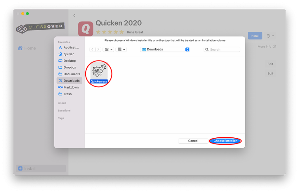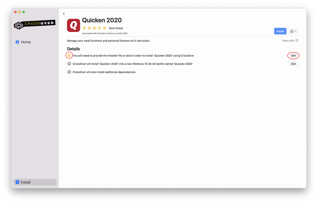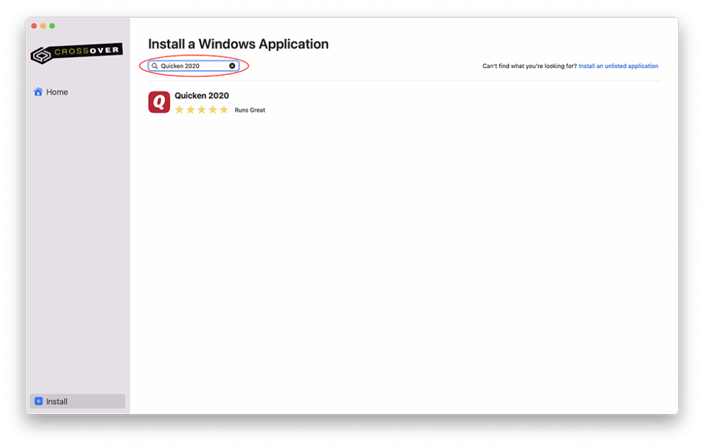 已列出的应用程序是指CrossOver为其预先配置了安装配置文件(即CrossTie)的应用程序。在某些情况下,CrossOver能够访问安装程序文件或知晓该文件的位置。在下面的示例中,我们将安装Quicken 2020。虽然Quicken 2020存在CrossTie配置文件,但CrossOver无法访问其安装程序文件。