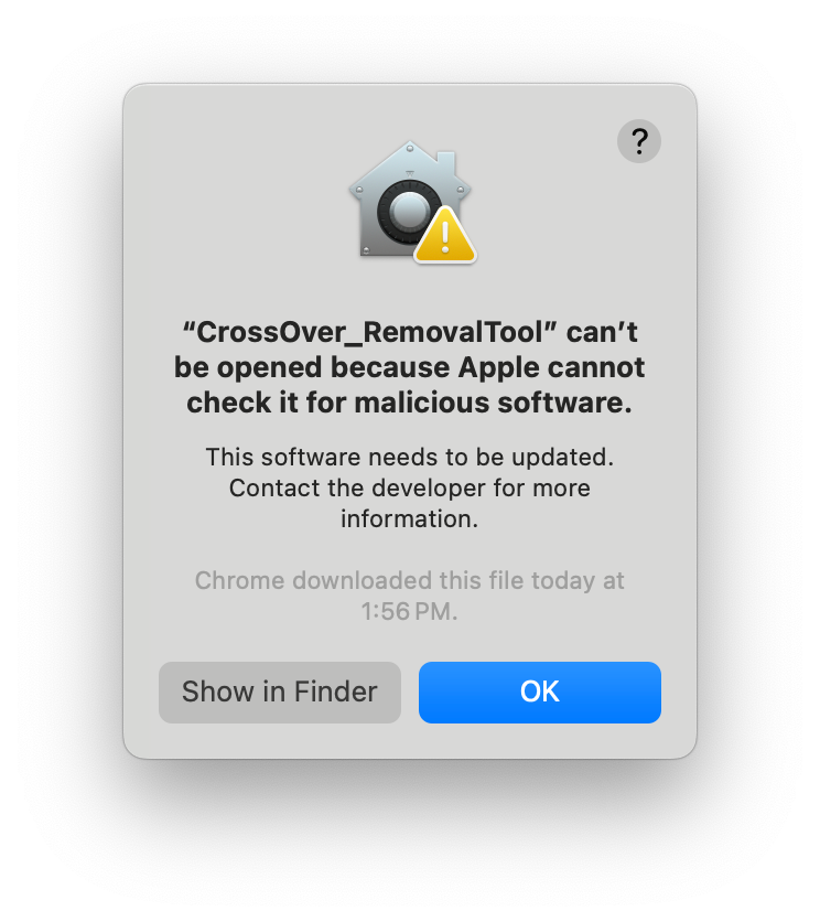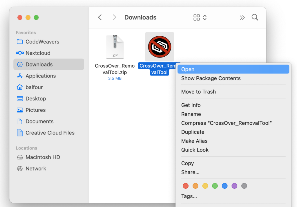 接下来,右键单击(按住Control键点击)CrossOver卸载工具图标,然后选择“打开”。这次工具将成功启动。