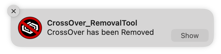 当工具完成卸载CrossOver后,屏幕右上角将显示一条通知。
