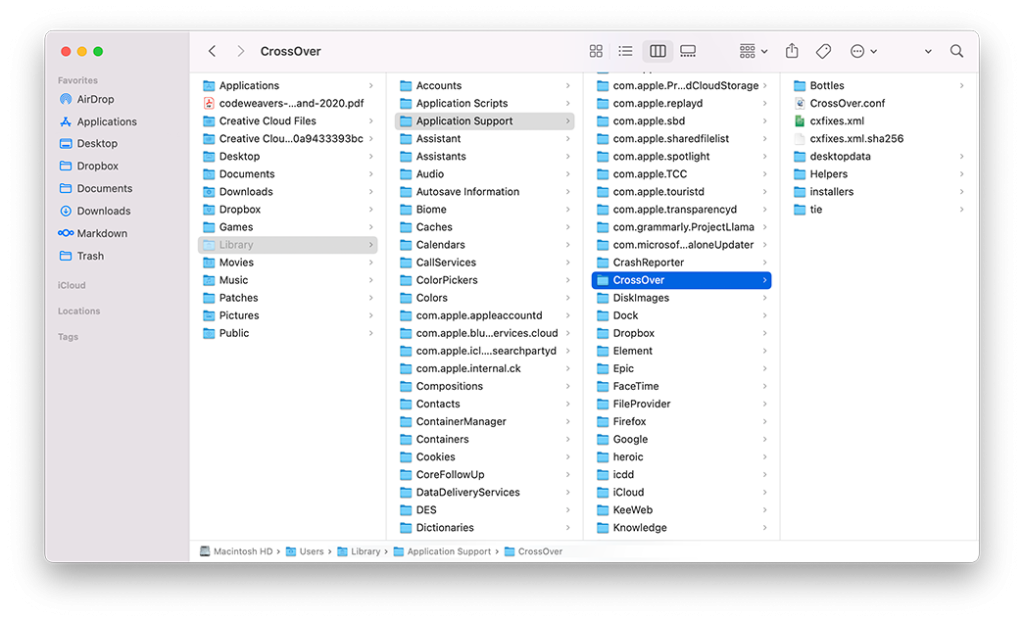 导航至Users>(用户名)文件夹)>Library>Application Support,将CrossOver文件夹拖入废纸篓。
