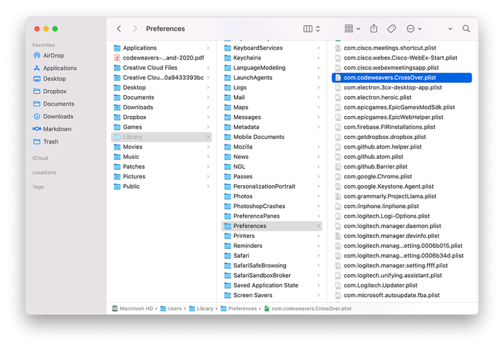 导航至Users>(home folder)>Library>Preferences,将所有以.com.codeweavers开头的文件拖至废纸篓。